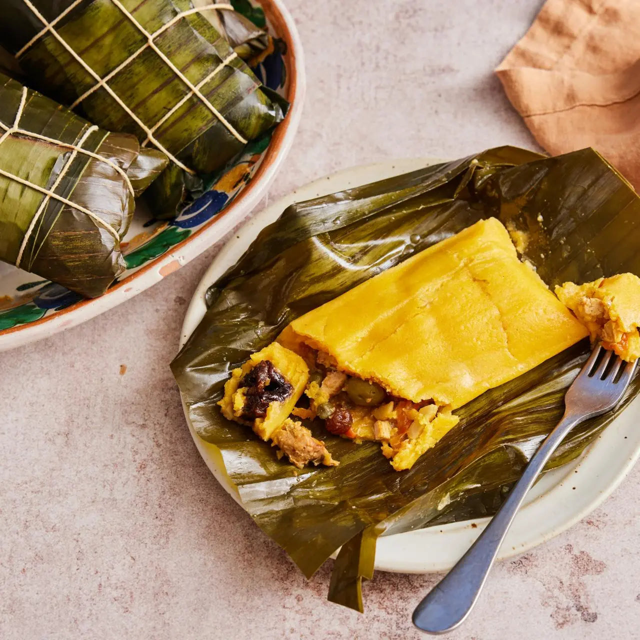 Hallacas - Traditional Venezuelan corn tamales stuffed with 3 meats — beef, pork and chicken — with olives, raisins and peppers, wrapped in banana leaves.
