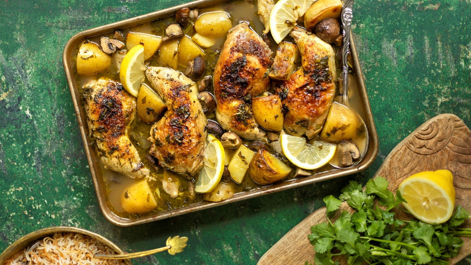 Tender chicken baked with golden potatoes, fresh garlic, and bright lemon juice. As it roasts, the pan fills with rich citrusy drippings that Lebanese families fight over with pieces of bread.Vegetarian option available