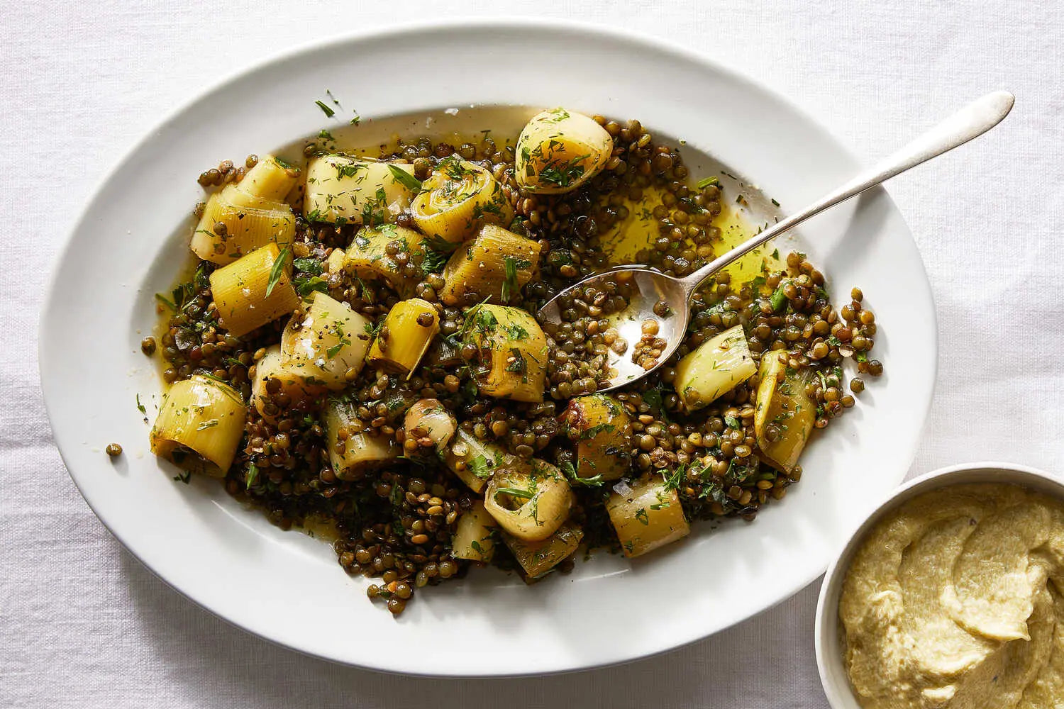 Tender, slow-cooked leeks serenade nutty black lentils