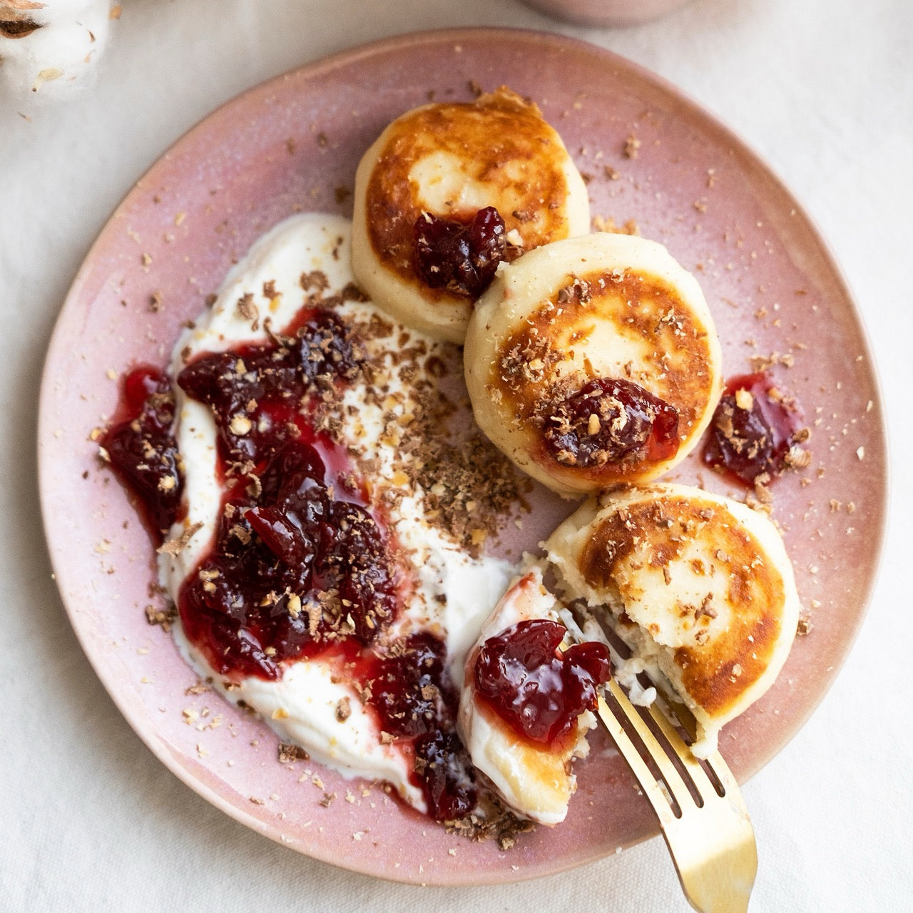 These small cheesecakes are made from a tender, homemade cottage cheese (творог | tvorog), which is battered and lightly fried. Equally enjoyed as a nourishing breakfast or as dessert with evening tea. Served with your choice of sour cream and home made jam or cгущёнка (sgushchonka) (condensed milk).