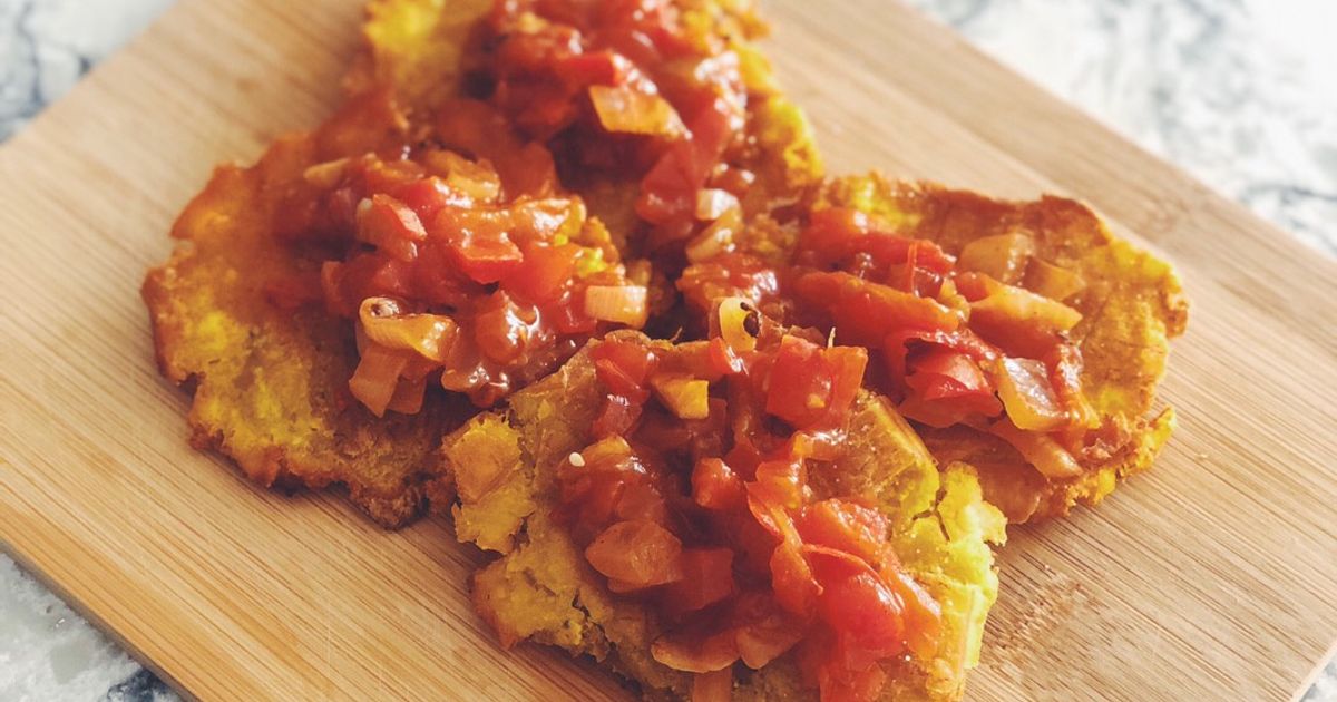 Patacones are a popular Latinx dish made from green (unripe) plantains, lightly fried to soften, flattened, and then fried again until golden and a bit crisp. Then they’re topped with hogao: an essential Colombian creole sauce made from slow-cooked tomatoes, green onions, garlic, and spices.
